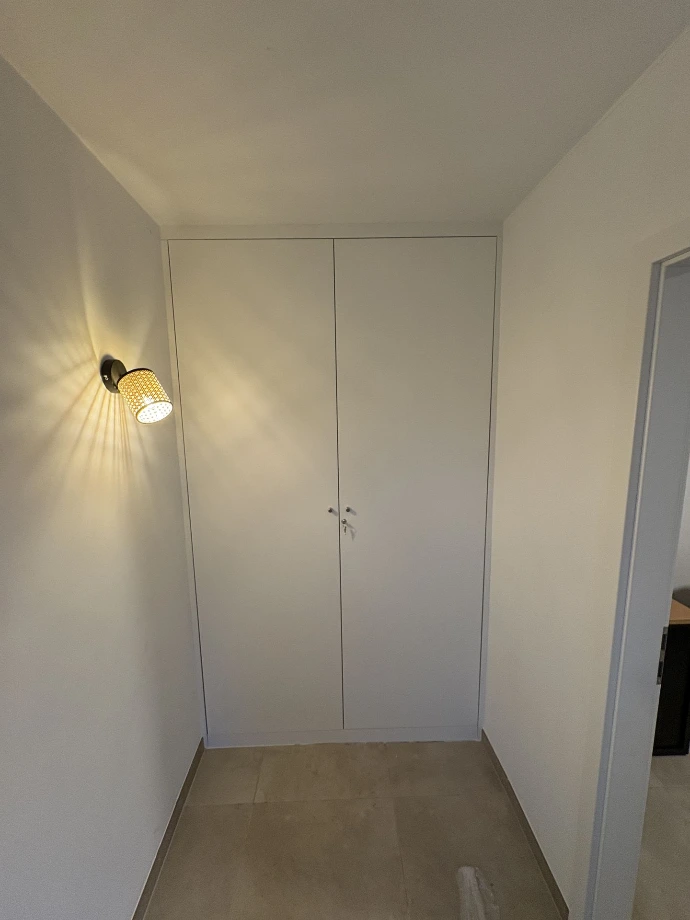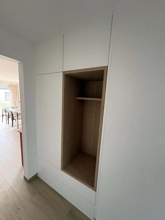 Réalisation d'un placard d'entrée en mélaminé Unilin Lily white avec une niche en plaqué chêne finition au rubio monocoat oil + 2c white 5%